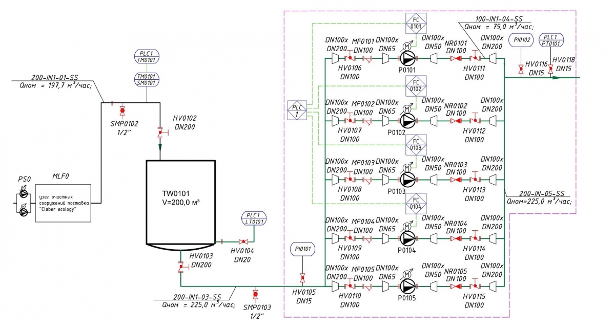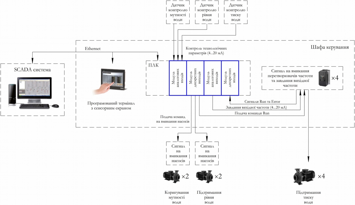 Система управління блоком накопичення та подачі вихідної води побудована на базі технологічної схеми, зображеної на рисунку 1.