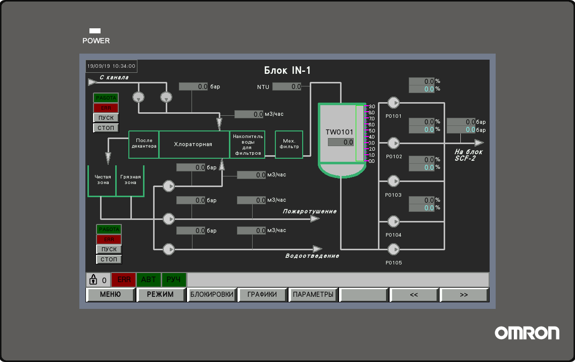 Система керування блоком накопичення та подачі вихідної води є складовою частиною загальної системи керування лінією водопідготовки. Система керування побудована на базі ПЛК Omron CJ2M-CPU34 та наступних функціональних модулів розширення: