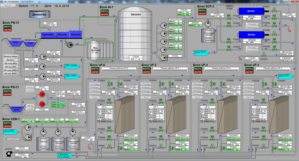 Система управління забезпечує роботу 17 блоків лінії водопідготовки за заданим алгоритмом з контролем наступних технологічних параметрів: