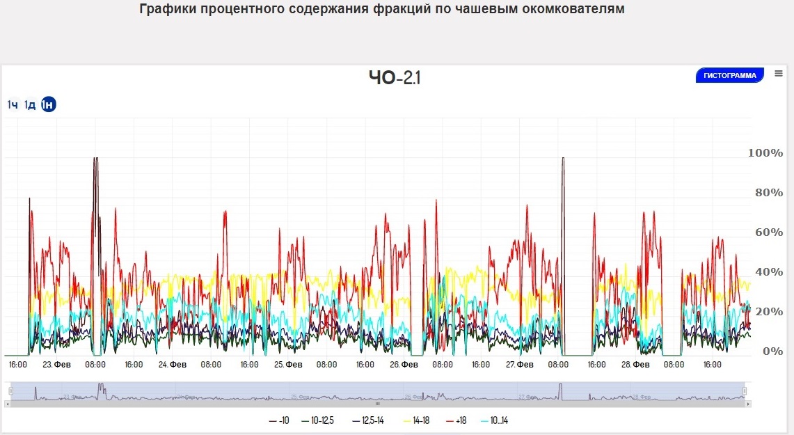 В результати обробки, отримуємо, кількість об'єктів відноситься до кожної групи крупності всього вимірюваного діапазон. Отримані дані передаються в логічний контролер, де відбувається перерахунок з площі в обсяг, пропорційний вазі і вираховується процентний вміст за класами крупності. Логічний контролер виробляє статистичну обробку отриманих даних. Аналізуючи розподіл даних за встановлену кількість вимірювань, обчислюється процентний вміст кожного класу крупності. Ця інформація зводиться до певного виду, що дозволяє відображати її графічно - гістограма, графік.