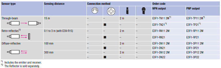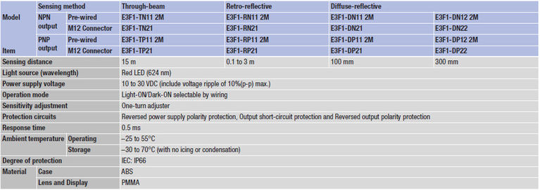 Стандартний фотоелектричний датчик M18 з найкращим співвідношенням ціни і якості Серія Omron E3F1 є фотоелектричні датчики розміру M18 кращої якості за конкурентними цінами. Вони відрізняються компактним корпусом, аналогічним корпусу E3FA і відповідають всім вимогам стандартних промислових застосувань.