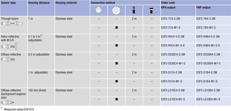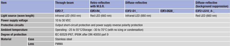 Фотоелектричний датчик в корпусі з нержавіючої сталі з різьбленням M18 Датчик E3F2-_-S для зон, які піддаються частій очищенню, з корпусом з нержавіючої сталі, що забезпечує підвищену стійкість до впливу миючих засобів і збільшення терміну служби датчика.