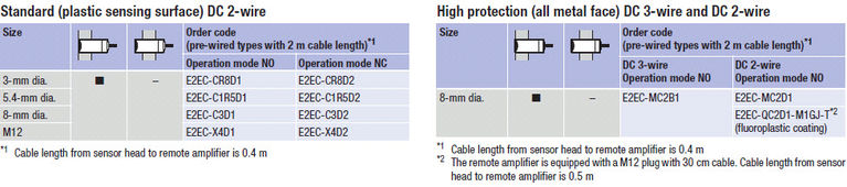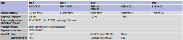 Надмініатюрний датчик для систем з особливими вимогами до монтажу Датчики сімейства E2EC оснащуються наймініатюрнішими чутливими головками для впевненого виявлення об'єктів в системах з обмеженими умовами монтажу. Мініатюрність головок датчиків досягається за рахунок відділення підсилювача від чутливого елемента. Однак на відміну від інших моделей з окремим підсилювачем, в моделях сімейства E2EC підсилювач вбудований в кабель, що спрощує монтаж.