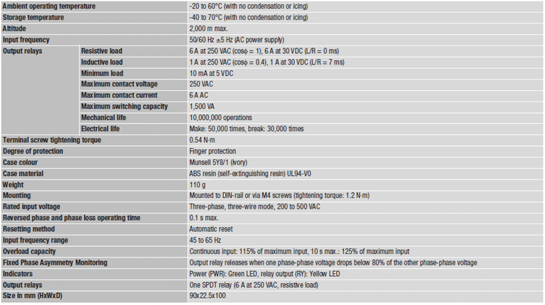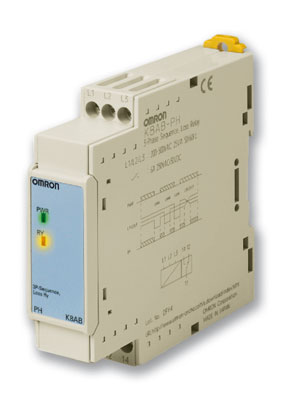 3-фазне реле контролю чергування, обриву фаз Реле контролю K8AB-PH1 призначене для контролю в 3-фазних 3-дротяних лініях електроживлення. Одночасно стежить за чергуванням фаз і обривом фаз під час запуску, а також за обривом фаз під час роботи. Релейний вихід розмикається при виявленні аварійного стану, і за станом сигналізації легко стежити за допомогою світлодіодного індикатора. Підходить для промислових об'єктів і обладнання.