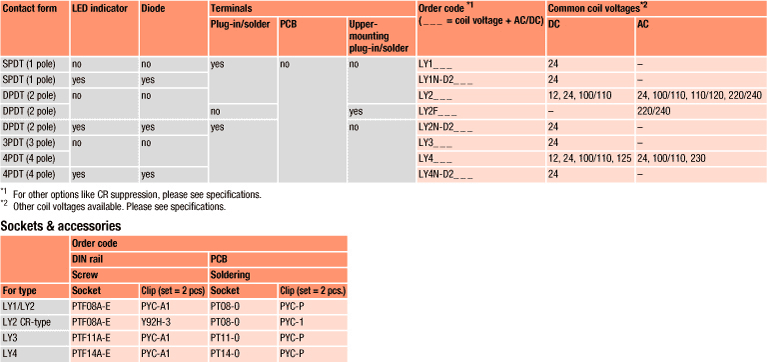Серія LY оснащена пристроєм гасіння дуги і вбудованим діодом. Реле серії LY поставляються в виконаннях з одним, двома, трьома і чотирма полюсами. Пропонуються моделі для монтажу на DIN-рейку за допомогою монтажної колодки, для монтажу на друковану плату, а також для фланцевого монтажу.