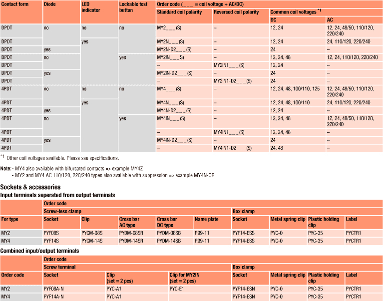 - Пропонуються наступні варіанти: герметичне реле (MYH), реле з механічним блокуванням (MY2K) і реле для друкованого монтажу.