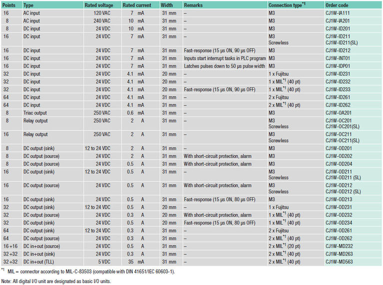 Від 8 до 64 точок введення/виведення в одному модулі - модулі входів, модулі виходів, комбіновані модулі входів/виходів Модулі дискретних входів/виходів представляють інтерфейс взаємодії ПЛК з зовнішнім світом, дозволяючи реалізувати швидке і надійне послідовне управління. Широкий асортимент модулів, від швидкісних входів постійної напруги до релейних виходів, дозволяє гнучко конфігурувати ПЛК CJ1/CJ2 під конкретну задачу управління. Сімейство CJ1/CJ2 включає модулі з різною щільністю входів/виходів і різними способами підключення. До 16 вхідних/вихідних ланцюгів можна підключати до модуля за допомогою від'єднується блоків гвинтових клем діаметра M3 або блоків безгвинтових клем з пружинними затискачами. Модулі з високою щільністю входів/виходів на 32 і 64 точки введення/виведення забезпечені стандартними роз'ємами під 40-жильний стрічковий кабель. Для простого підключення ланцюгів до модулів з високою щільністю входів/виходів пропонуються готові кабелі і клеми. |