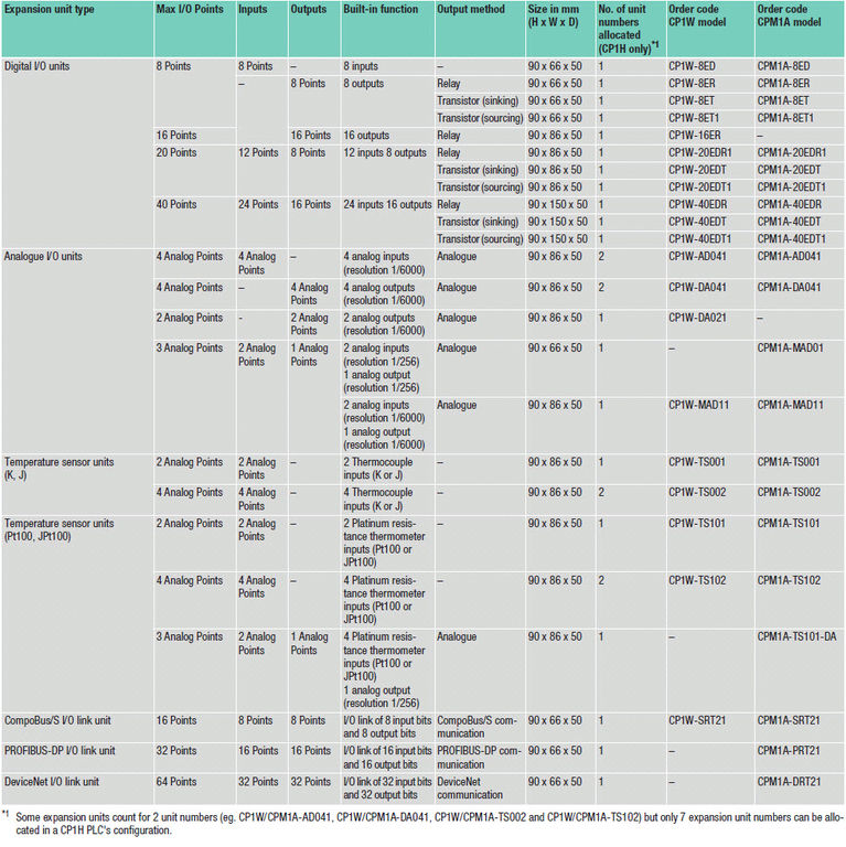 Широкий асортимент модулів розширення, що включає модулі дискретних, аналогових входів / виходів, а також відомі модулі для польових мереж, дозволяє вирішувати будь-які завдання автоматизації базового рівня. Модулі розширення серії CP1W / CPM1A можна використовувати в ПЛК серій CPM1A-, CPM2A-, CP1E-, CP1L- і CP1H-.