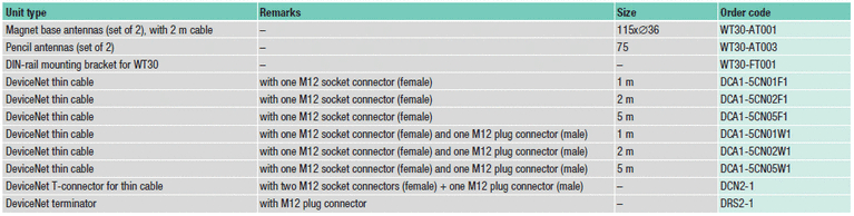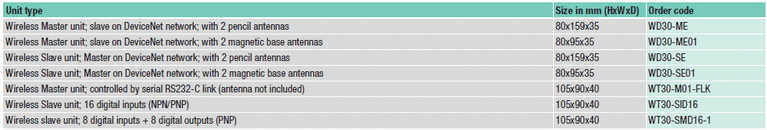 Бездротова мережа DeviceNet Вам необхідно проводити обмін дискретними даними, але ви не можете скористатися для цього звичайним кабелем або хочете звести кабельні з'єднання до мінімуму? Скористайтеся системою WT30! Система складається з ведучого пристрою послідовного інтерфейсу WT30-M і ведених пристроїв введення / виводу WT30-S декількох типів. Введення / висновок даних, вироблений пристроями WT30-S, управляється і контролюється модулем WT30-M по послідовному інтерфейсу CompoWay / F. Для управління і контролю введення / виводу даних, виробленого модулями WT30-S, також можна використовувати WD30-ME V2 - ведучий пристрій бездротової мережі DeviceNet. Випускаються моделі модулів WT30-S з 16 входами і з 8 входами / 8 виходами. Для різних областей застосування пропонуються антени різних типів.