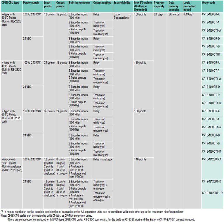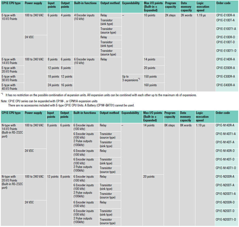 Економічний контролер обладнання Наша серія CP1E здатна повністю задовольнити потребу в управлінні у відносно простих областях застосування, включаючи чудову можливість позиціонування. Всі ЦПУ CP1E передбачають високошвидкісну шину USB для забезпечення швидкого програмування. Програмне забезпечення "Easy Input Editor" дозволяє прискорити програмування шляхом використання редактора з функцією інтуїтивною підказки для створення впорядкованої прикладної програми. Серія CP1E представлена двома типами пристроїв: пристрій CP1E-E є найбільш економічним, тоді як CP1E-N передбачає вбудований годинник реального часу, функції управління рухом і послідовний порт для підключення HMI, пристрої зчитування штрих-коду або іншого пристрою з послідовним інтерфейсом. Для поліпшення функціональності передбачені кілька додаткових модулів. Так як серія CP1E має однакову будову з серіями CP1L, CP1H, CJ і CS, її програми сумісні для розподілу пам'яті і команд. |