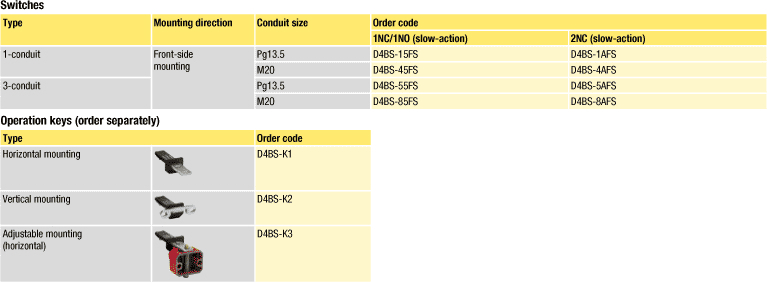 До складу серії D4BS входять двоконтактні моделі з комбінацією контактів 1НЗ / 1НР і 2НЗ, виконані в міцному металевому корпусі. Також передбачені моделі з роз'ємом M12 і моделі з отворами (включаючи M20) для введення кабелю.