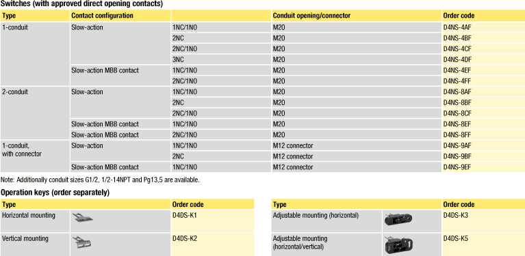 На додаток до колишніх комбінацій контактів - 1НЗ / 1НР І 2НЗ, до складу серії D4NS увійшли трьохконтактні моделі з комбінаціями контактів 2НЗ / 1НЗ І 3НЗ. Також передбачені моделі з роз'ємом M12 і моделі з отворами (включаючи M20) для введення кабелю.