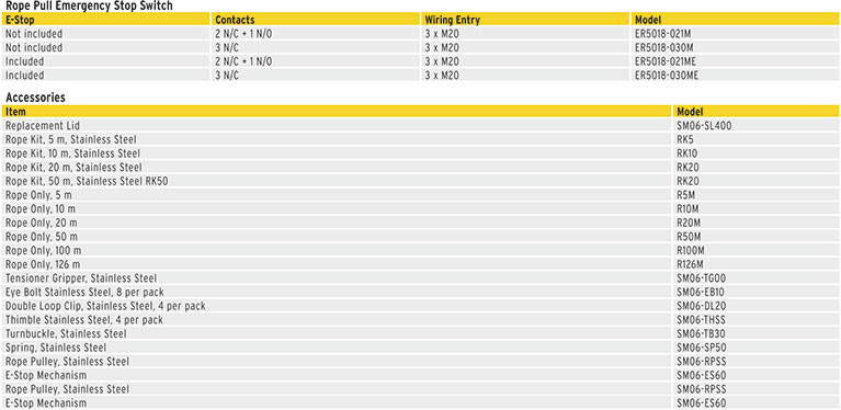 Kомпактні тросові вимикачі аварійної зупинки Лінійка тросових вимикачів ER5018 забезпечує базові функції при максимальному прольоті троса 40 м. Для спрощення монтажу і налаштування передбачені комплекти тросів, а також повний асортимент додаткових аксесуарів.