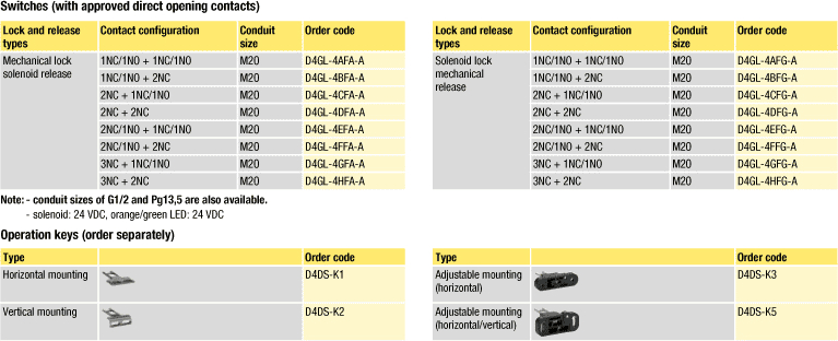 Вимикач блокування дверей захисної огорожі Вимикачі D4GL для блокування дверей захисної огорожі випускаються в варіантах з чотирма або п'ятьма вбудованими контактами. У стані блокування їх сила замикання (утримує сила) досягає 1000 Н. Функціональна завершеність серії забезпечена безліччю модифікацій, включаючи моделі з механічним блокуванням і електромагнітним відмиканням, моделі з електромагнітним блокуванням і механічним відмиканням, з отворами для введення кабелю різного розміру, аж до M20.