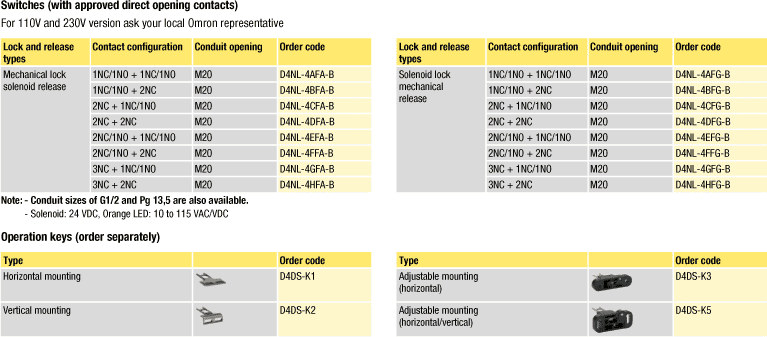 Вимикач блокування дверей захисної огорожі в пластиковому корпусі Вимикачі D4NL для блокування дверей захисної огорожі випускаються в варіантах з чотирма або п'ятьма вбудованими контактами. У стані блокування сила замикання (утримує сила) у них сягає 1300 Н. Функціональна завершеність серії забезпечена безліччю модифікацій, включаючи моделі з механічним блокуванням і електромагнітним відмиканням, моделі з електромагнітним блокуванням і механічним відмиканням, з отворами для введення кабелю різного розміру, аж до M20 .