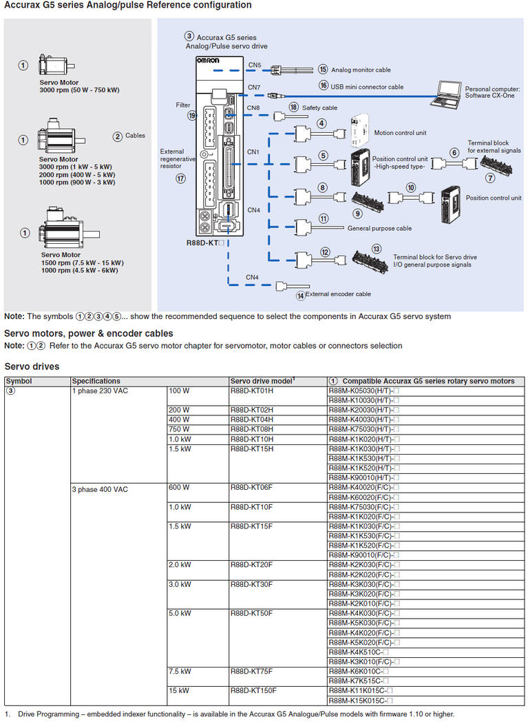 Сервоприводи Accurax G5 з аналоговим / імпульсним керуванням мають функції вбудованого контролера. Даний контролер має набір команд управління рухом і операцій умовного і безумовного переходу. Цей функціонал ідеально підходить для простих завдань позиціонування (наприклад, складальні машини, сортування, вибірка і переміщення). Програмування ведеться на мові блок-схем в програмному забезпеченні CX-Drive - в тому ж проекті, де зберігаються параметри сервоприводу.