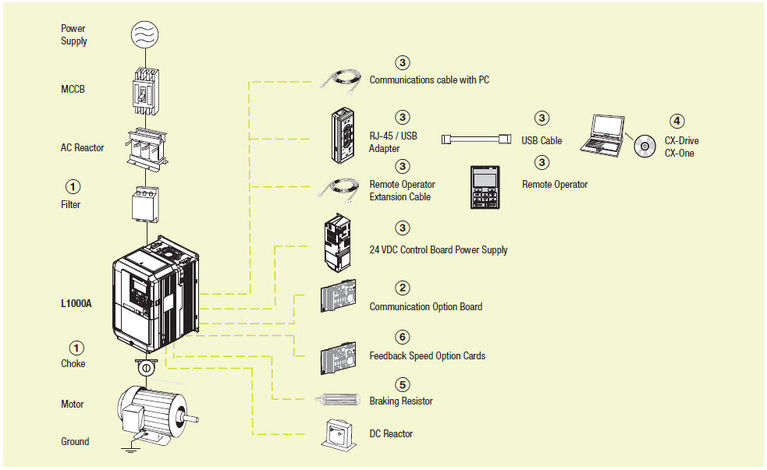 Інвертор L1000A забезпечує повнофункціональне управління асинхронними двигунами і двигунами з постійними магнітами, що застосовуються в підйомному обладнанні. Крім того, інвертор L1000A простий в установці і може застосовуватись майже в будь-яких підйомних пристроях.