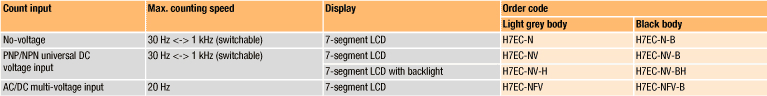 Моделі серії H7E оснащені великим РК-дисплеєм з висотою символів 8,6 мм. У складі серії є моделі із заднім підсвічуванням індикатора, що підвищує видимість показань в умовах поганого освітлення. Серія H7E включає накопичувальні лічильники, таймери, тахометри і лічильники, призначені для монтажу на панель.