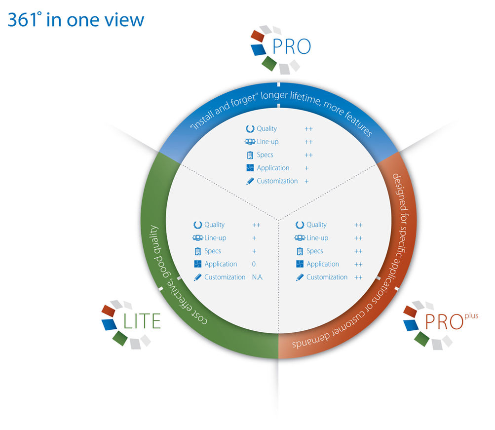 Три различных линейки LITE, PRO и PROplus Новая концепция 361° предлагает три линейки продукции в каждой категории датчиков и компонентов. При этом, каждая линейка соответствует различным потребностям клиентов.